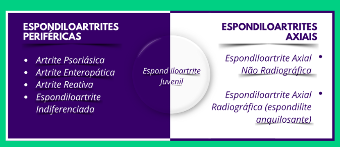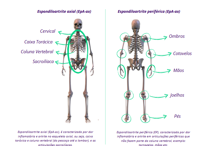Como já mencionado, as Espondiloartrites referem-se a uma família de doenças autoimunes intimamente relacionadas e que compartilham algumas características em comum – a principal delas é a artrite (inflamação articular) que acomete: